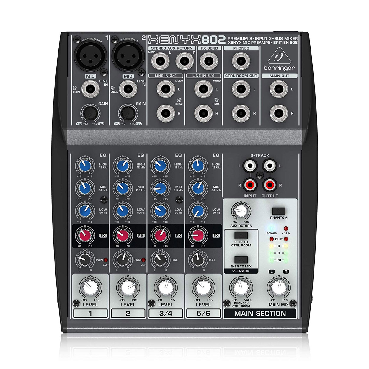 ✔︎ Neo-classic “British” 3-band EQs for warm and musical sound. Never use unbalanced XLR connectors PIN 1 and 3 connected on the MIC input connectors when using the phantom power supply